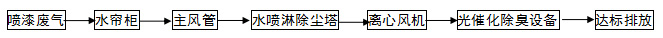 二、噴漆廢氣處理設(shè)備(水噴淋除塵塔+光催化除臭設(shè)備)處理工藝說明: